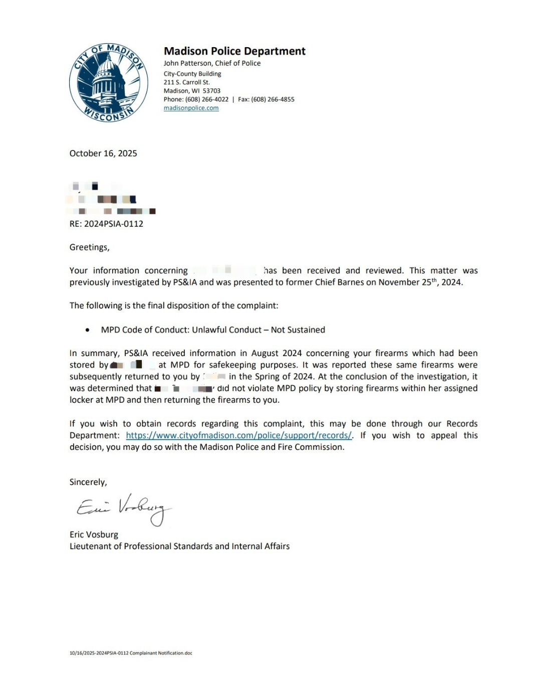 Please route all media or legal inquiries to the contact information provided above. This matter has been referred to the Madison Police Independent Oversight Committee for further review.